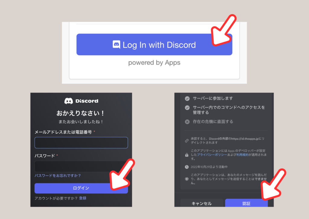 - Discordにログイン(先ほど登録したメールアドレスとパスワード)して、「認証」ボタンをタップ